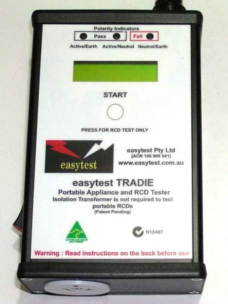 The easytest TRADIE tests all plug-in appliances, power boards, extension leads and 30mA RCDs to the Standard required by AS/NZS 3760 and combines all the features and benefits of the DUO, miniPAT and the miniRCD tester in one small, hand held, easy to use, cheap unit. Its advantage over the DUO is this unit can test portable RCDs without the need for an isolation transformer. It does not get any easier than this!